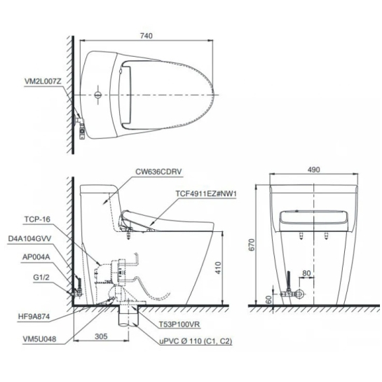Thông tin bồn cầu TOTO MS636CDRW12 nắp rửa điện tử