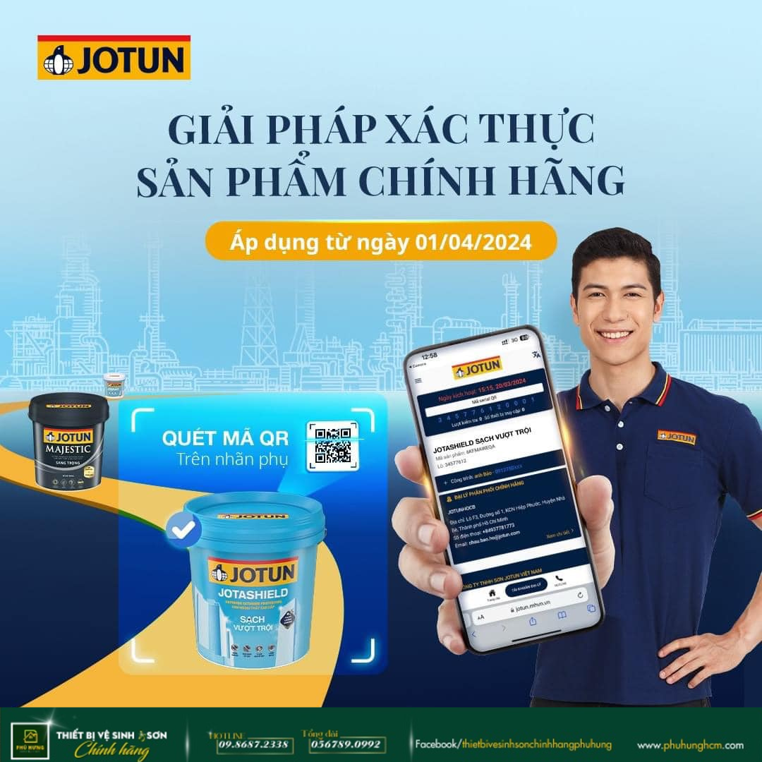 - Có mã QR hoặc mã số xác thực để người dùng quét kiểm tra qua ứng dụng hoặc số hotline của Jotun.