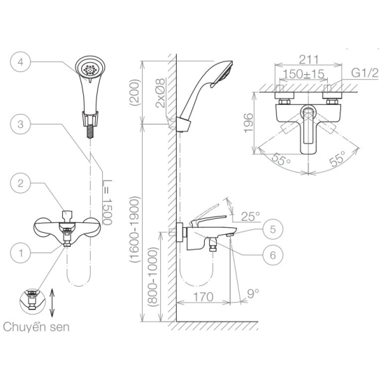 Bản vẽ kỹ thuật vòi sen VG542 nóng lạnh
